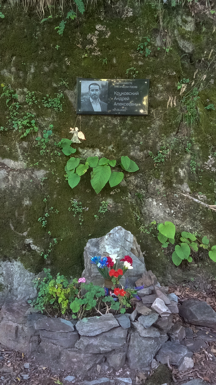 Позже у крепости я узнал, что между забором и скалой есть небольшая щель, через которую можно пролезть, поэтому спустился короткой дорогой. Здесь какое-то время была калитка и ступеньки, ведущие наверх, но после трагедии 2022 года калитку убрали, поставили запрещающие знаки, а ступеньки внизу снесли. Рядом есть памятная табличка. На фпагменте карты ниже я очень приблизительно по памяти отметил свой маршрут (геолокация в этом месте работала с погрешностью в десятки метров), а план крепости сопоставил с видимыми очертаниями стен на зимнем снимке 2014 года Google Earth и наложил на более свежий снимок Тропинка начинается за домом на улице Березовой 49, но при подъеме я не заметил поворот направо к крепости и ушел далеко наверх. Минут через сорок подъема я потерял надежду выйти к крепости по тропинке и уже прочесывавал окружающий лес, когда вдруг услышал голоса со стороны тропинки. Это была группа туристов или спортсменов, которые спускались вниз. Они сказали, что я прошел мимо крепости и могу вернуться к нужному повороту вместе с ними | ||||