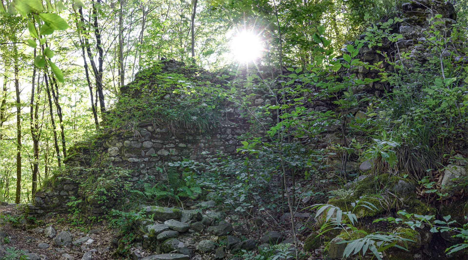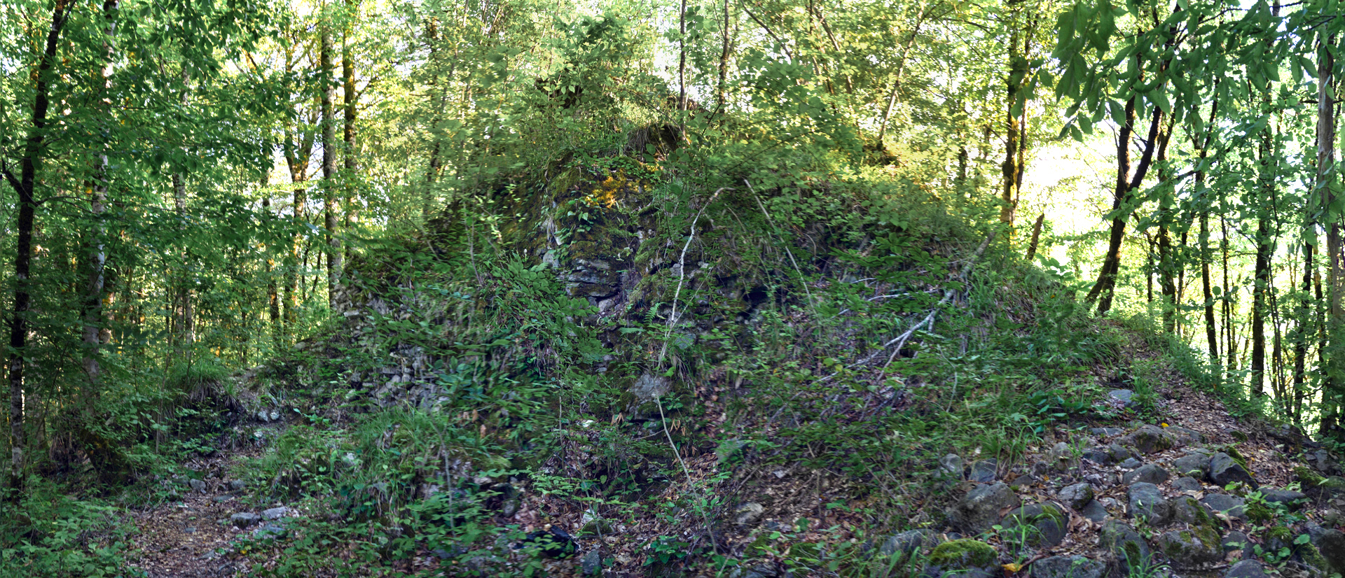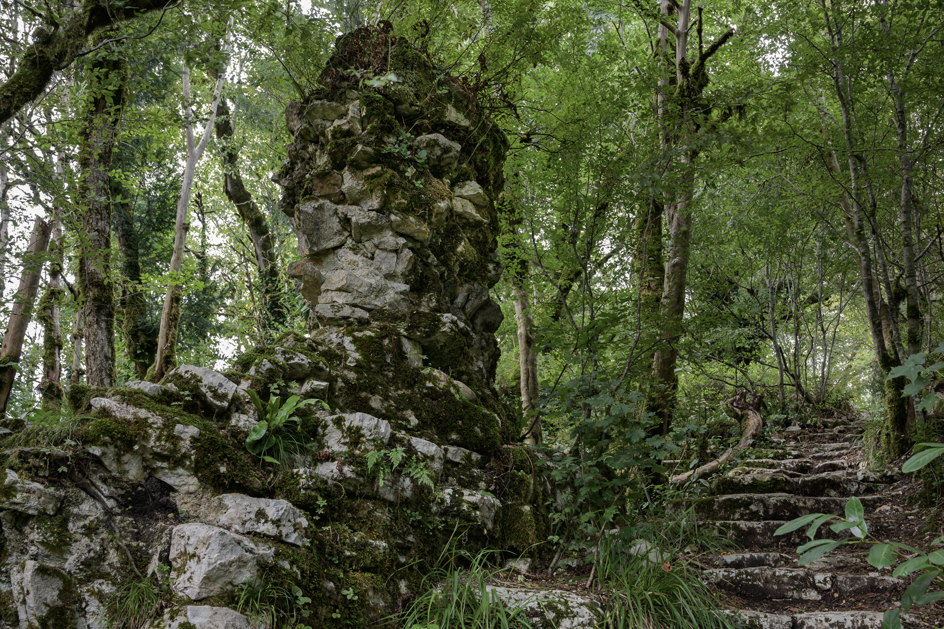 Крепость была построена предположительно во второй половине VII – начале VIII вв, но позже перестраивалась и просуществовала до XIII (возможно, XIV) века. Фотографии в статье 2009 года, ссылку на которую я привел выше, были сделаны во время археологических работ много лет назад. Руины, очищенные тогда от растительности, уже покрылись кустами, деревьями и прочей живностью. Возвращаться к крепости в обозримом будущем я не планировал, поэтому, несмотря на вечер в горах и большие перепады освещенности, попробовал делать панорамы, чтобы сохранить более полное представление о том, как все здесь выглядело в 2025 году. Получившиеся фотографии мне не понравились, и долгое время я не хотел делать заметку о крепости, но потом решил, что информация может быть кому-нибудь полезна. Восточную часть угловой башни я обошел с юга на север, снимая в западном направлении | ||||