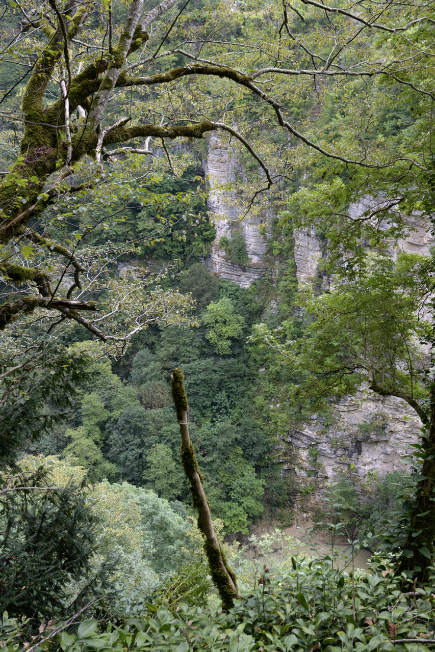 Между деревьями временами было видно ущелье и скалы высотой в сотни метров | ||||
