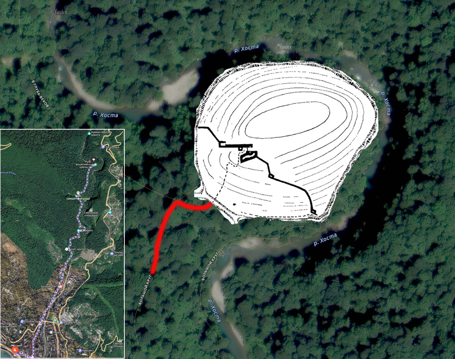 На фпагмент карты я наложил план крепости из книги Ю. Н. Воронова "Древности Сочи и его окрестностей", ориентируясь на рельеф