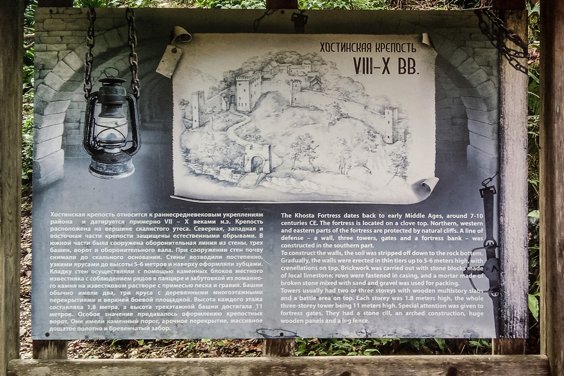 Хостинская крепость (византийская, генуэзская и т.д.) находится на территории современной Тисо-самшитовой рощи Кавказского заповедника в Хосте. Разные "навигаторы" и картографические сервисы отлично прокладывают маршрут, но можно обойтись и без них. Я шел от вокзала в Хосте вверх вдоль правого берега реки Хоста мимо больницы №3 и Старого кладбища, где в начале девяностых искал и не нашел могилу своего деда. Дорога идет дальше и приводит в "визит-центр" заповедника, в котором я купил билет и пошел вверх по тропинке. В крепость можно попасть по «большому кольцу». Маршрут простой и понятный без указателей. Было жарко и влажно, поэтому двух литров воды, которые я брал с собой, едва хватило на дорогу туда и обратно | ||||