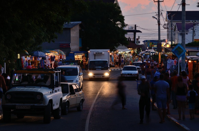 | Автомобильные и железные дороги на Черноморском побережье Кавказа идут вдоль берега и часто отделяют пляжи от многочисленных городов и поселков. Расстояния между поселками невелики и иногда кажется, что едешь через какой-то невероятно длинный город. Летом здесь много туристов и на улицах очень оживленно до позднего вечера |