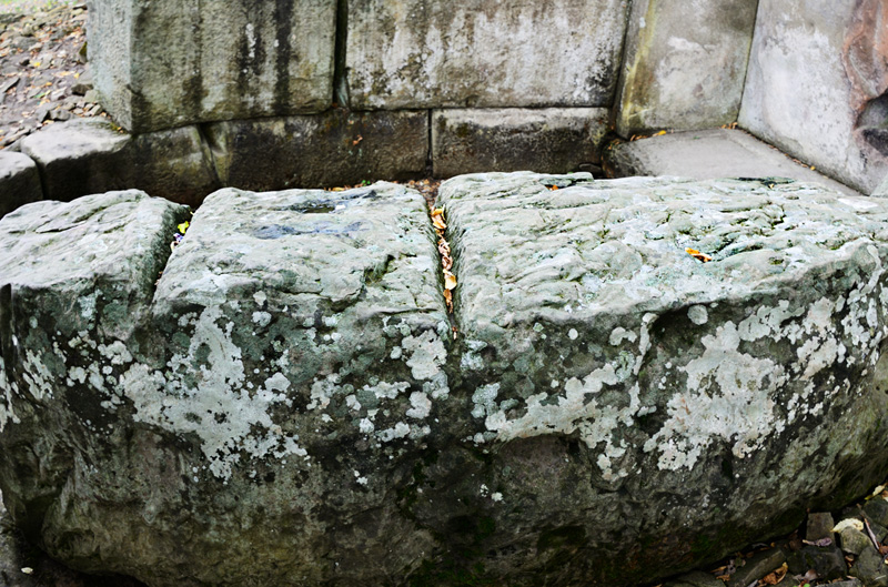 | Назначение некоторых следов обработки камней трудно понять, но стены дворика перед дольменом были выше. Углубления в камне могли облегчать сборку или транспортировку блоков с места, где их вырубали из скал |
