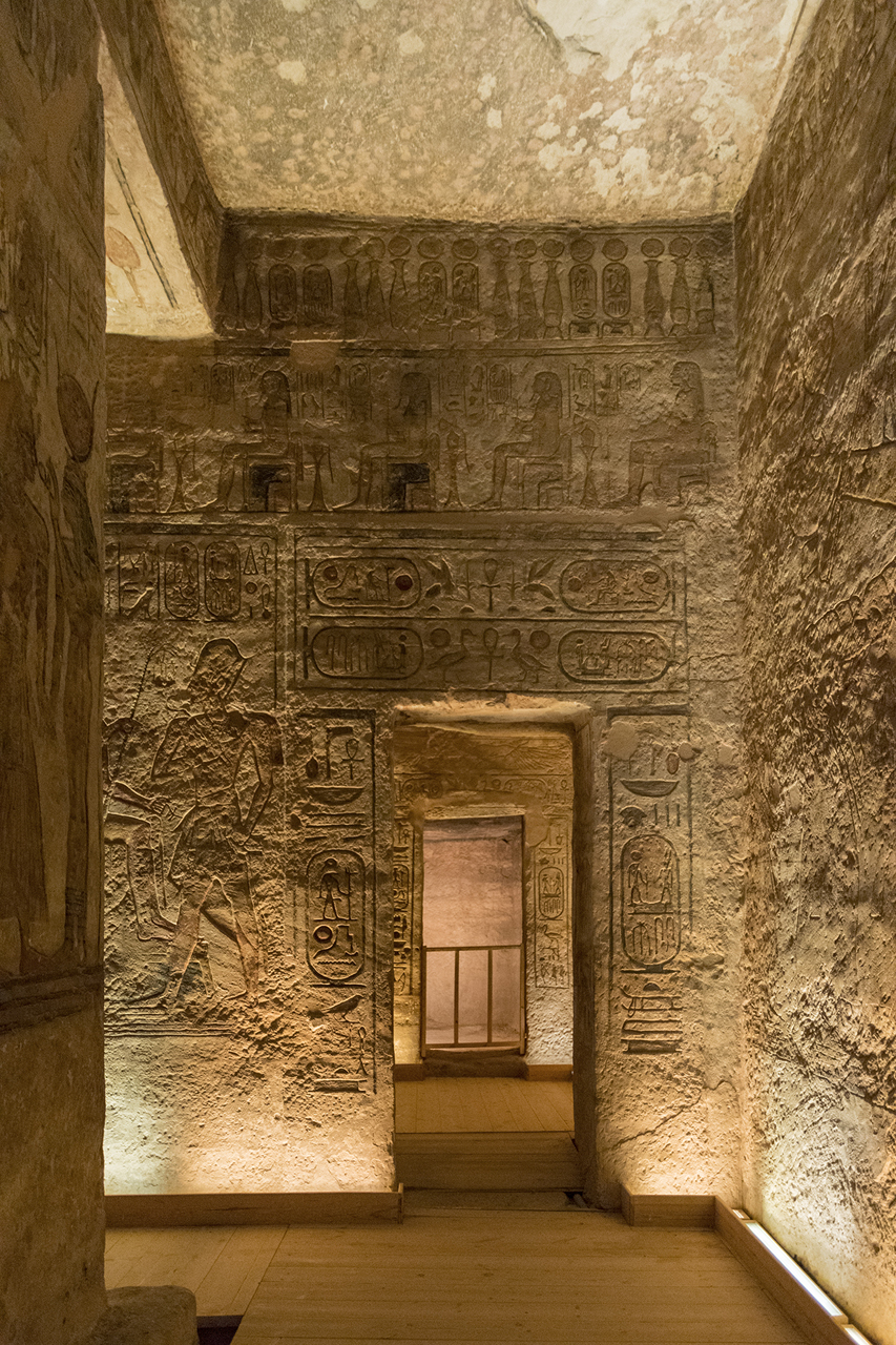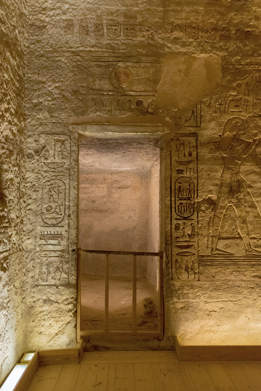 В святилище Хатхор в образе коровы будто выходит из скалы. Здесь тоже искусственное освещение "дополняет" солнечный свет, а часть Хатхор в скале закрыта тенью | ||||||||