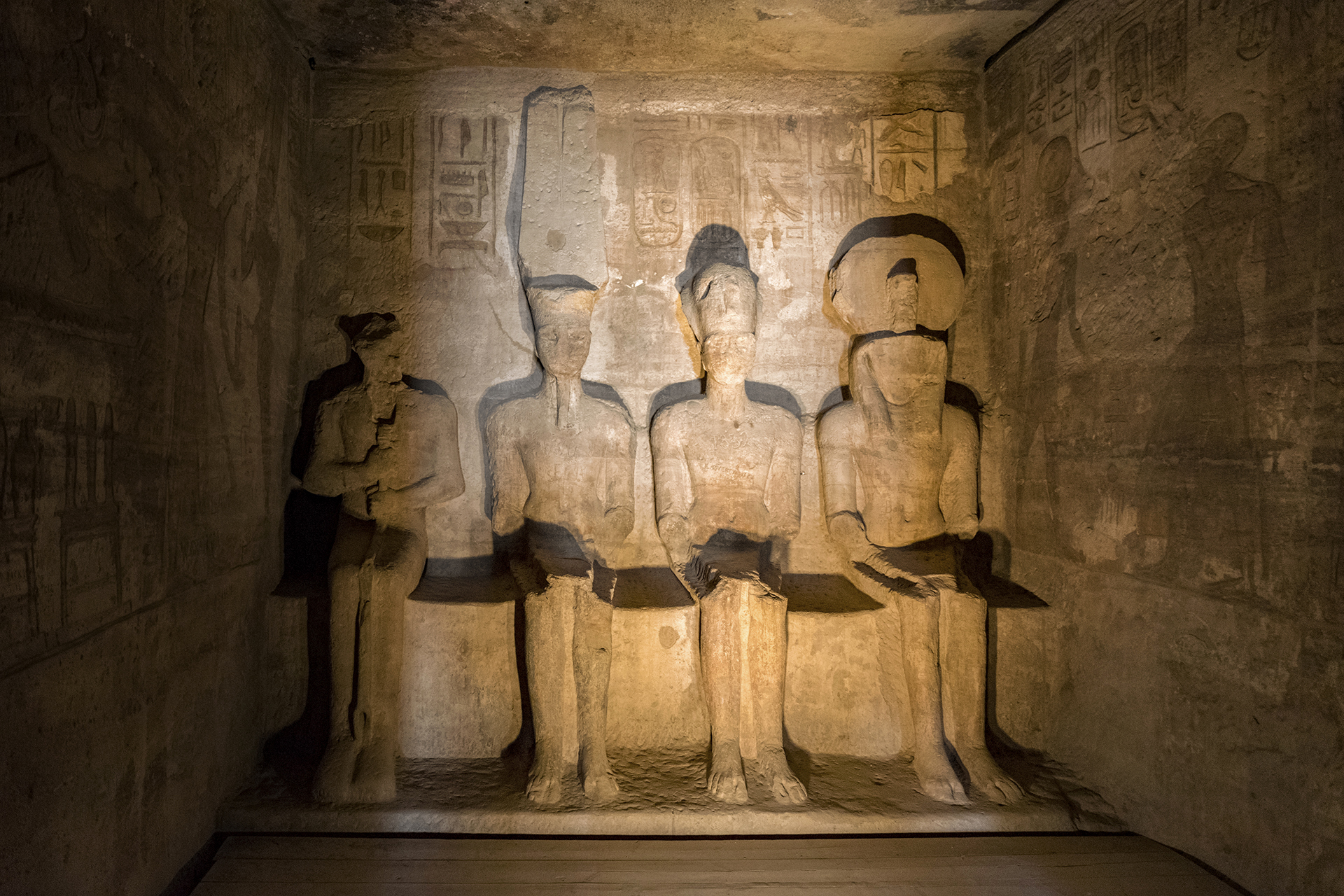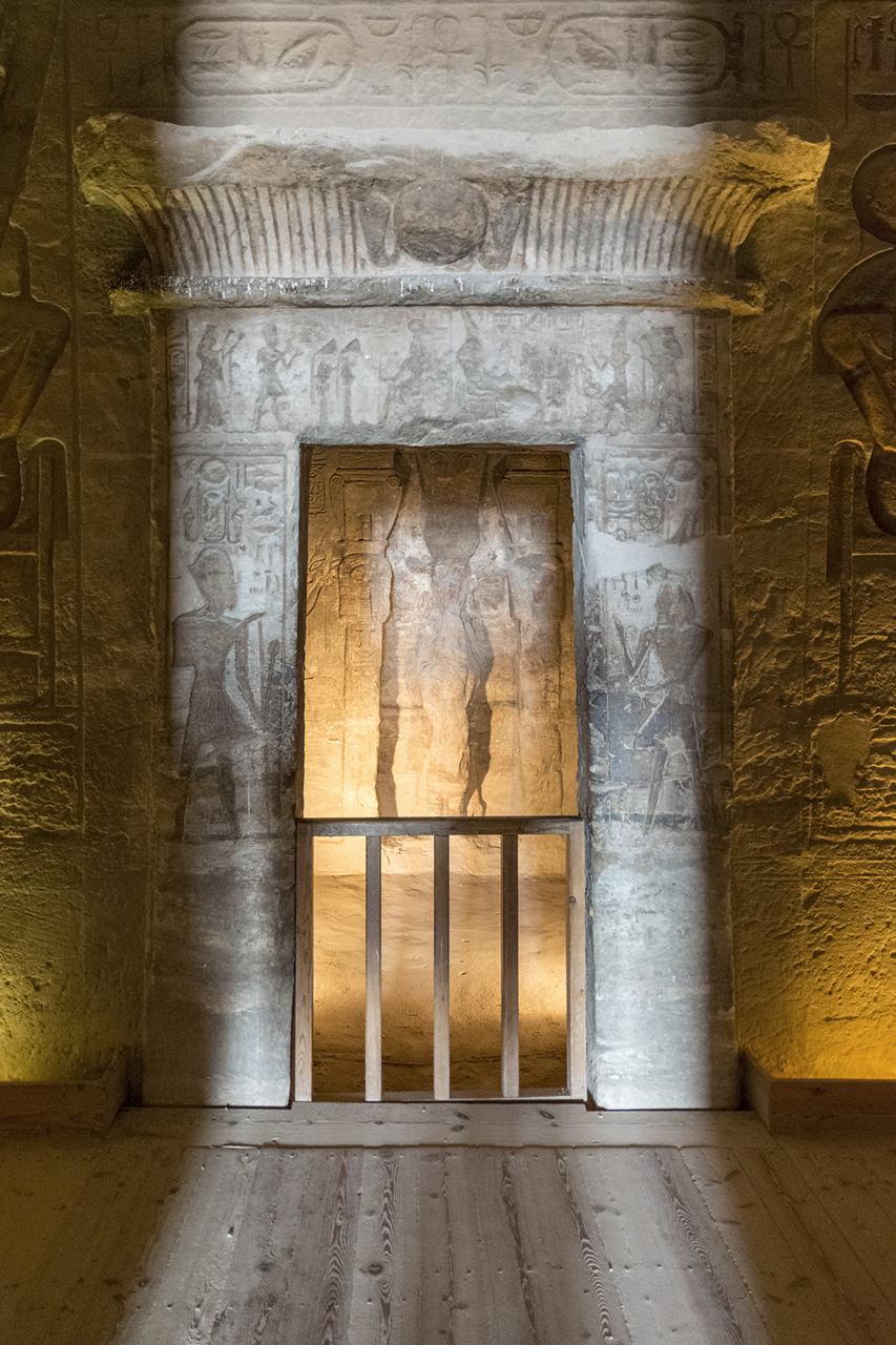 Центральный проход ведет в святилище, где находятся статуи Птаха, Амона, Рамсеса II и Ра-Хорахте. Во многих источниках сообщают, что только 22 февраля и 22 октября в 6 утра солнце освещало статуи богов. По 6 минут солнцем были освещены Амон и Ра-Хорахте, а 12 минут освещалась фигура Рамзеса II. На Птаха солнце никогда не падало, потому что он символизировал загробное царство. Но это могло бы быть в том храме, который стоял на берегу Нила. Якобы и сейчас толпы туристов приезжают два раза в год увидеть это чудесное явление. Я был в храме 21 февраля и видел все почти так, как описывают. Дело в том, что в храме есть искусственная подсветка, которая создает похожий эффект каждый день с утра до вечера. Храм стоит на новом месте, поэтому проверить, как было в прошлом, уже невозможно | ||||||||
