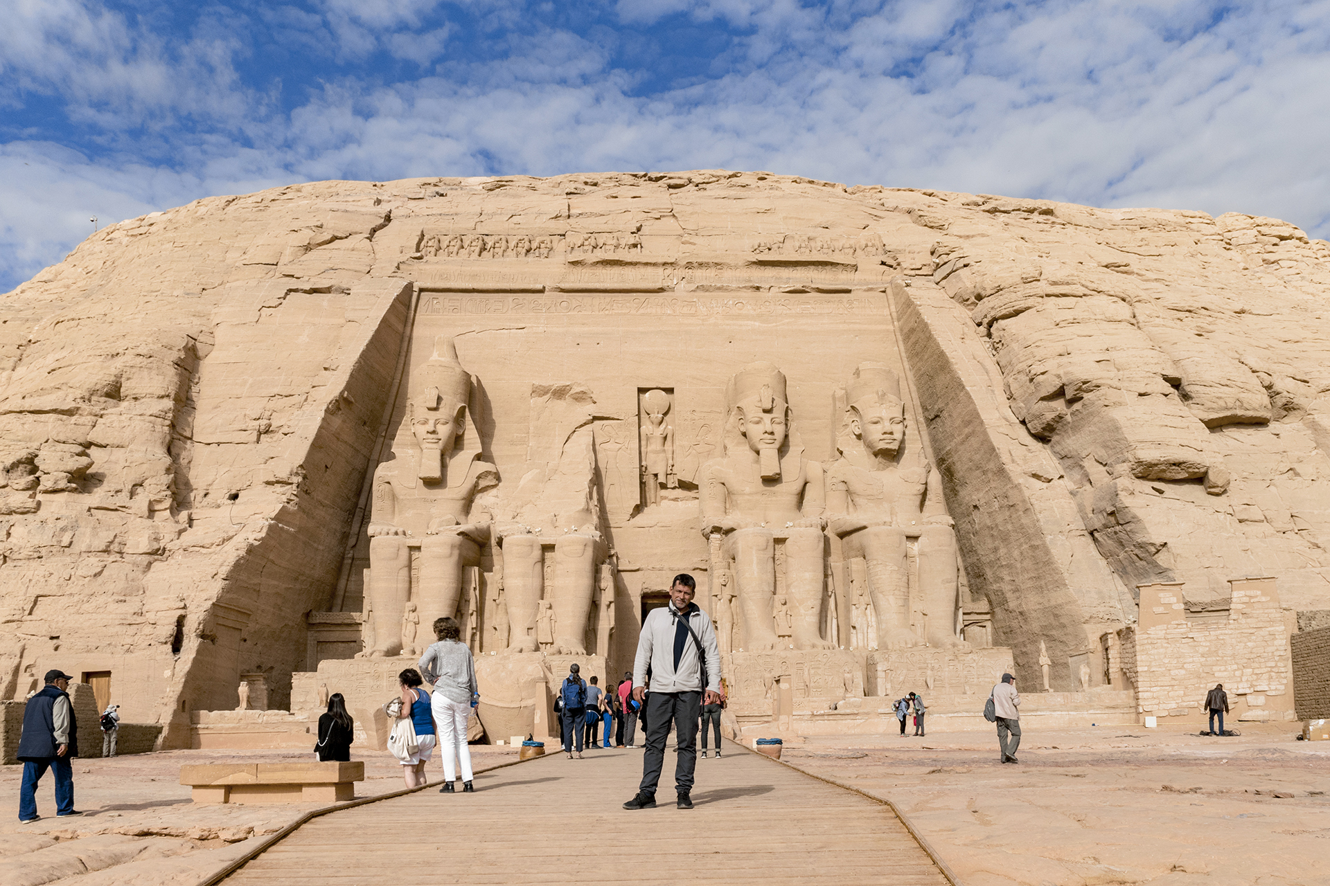 Романтики поубавилось, но хорошо, что храмы вообще можно увидеть почти в том виде, какими они были созданы в правление Рамсеса II в середине 13 века до нашей эры (или примерно 3300 лет назад). Высота 4 статуй Большого храма, высеченных в скале, около 20 метров. Уже в 6 веке до нашей эры храмы были частично засыпаны песком. Позже они и вовсе были забыты. В новое время их открыл в 1813 году Иоганн Буркхардт, который поднялся по Нилу в Нубию. Его целью было пересечь пустыню и найти истоки реки Нигер. Он не нашел истоки Нигера, но в ходе своих путешествий заново открыл для европейцев Пальмиру, Петру и Абу-Симбел. Первое обследование храмов в Абу-Симбел провел Джованни Бельцони в 1817 году. Бельцони со второй попытки очистил входы от песка и проник внутрь. Большой храм был воздвигнут в честь Рамсеса II и посвящен Амону, Птаху и Ра-Хорахте или Ра-Горахти (Ра и Гор в одном образе). Четыре гигантских статуи у входа изображают самого Рамсеса II. В некоторых источниках говорится, что это три бога и Рамсес, но все статуи похожи, и мне кажется, что они изображают Рамсеса. Небольшие статуи у ног изображают мать, жену и детей Рамсеса Мы приехали первыми, но в течение часа у храма уже скопилось так много туристов, что на снимках все время оказывались люди, а не статуи. Солнце в это время года почти не оставляет тени, что несколько усложняет фотографирование. Внутри храмов очень тесно и высоко. Если даже удавалось отойти на расстояние, достаточное, чтобы поместить что-то в кадр, тут же перед фотоаппаратом проходили или вовсе останавливались туристы. Если отогнать одних, на их место через секунду встают другие. Нужно учитывать и сложное сочетание дневного света, проникающего снаружи, и искусственного освещения разными лампами внутри. На фотографиях, сделанных внутри храма, это смешанное освещение хорошо заметно | ||||||||