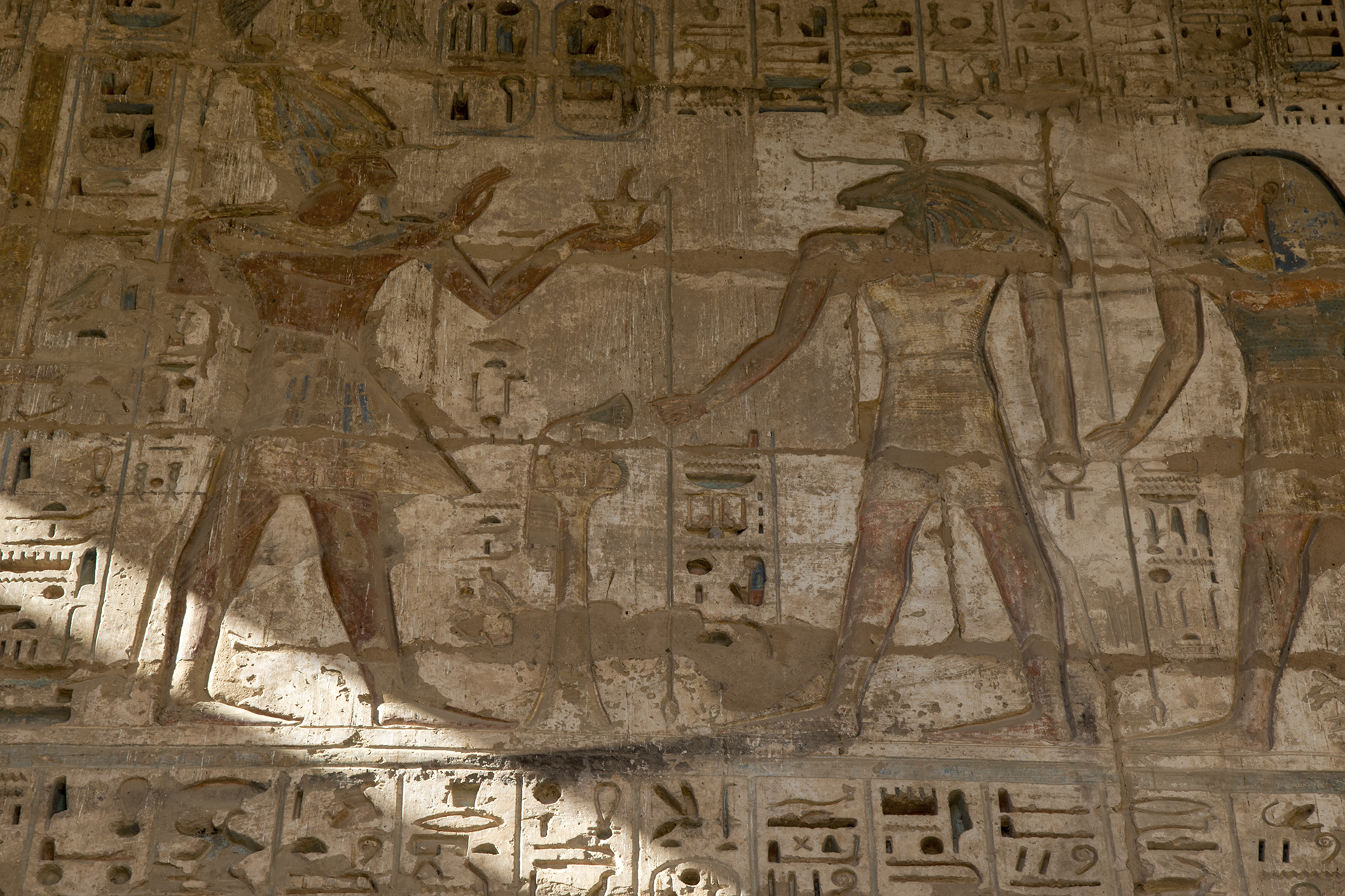 Западная и восточная стороны двора. Я читал, что статуи у столбов разрушили христиане или мусульмане, и это было актом вандализма. У меня есть сомнения на этот счет, потому что статуи северной стены не тронули, а лица сбиты не на всех рельефах. Вполне вероятно, что "вандализмом" занимались еще в дохристианскую эпоху. Фараоны время от времени перебивали картуши, разбирали чужие храмы для постройки своих, уничтожали память о предшественниках и вандализмом это не считали. Часто разрушение старых сооружений для постройки новых было связано с периодами упадка, когда ресурсов для добычи новых материалов просто не было | ||||||