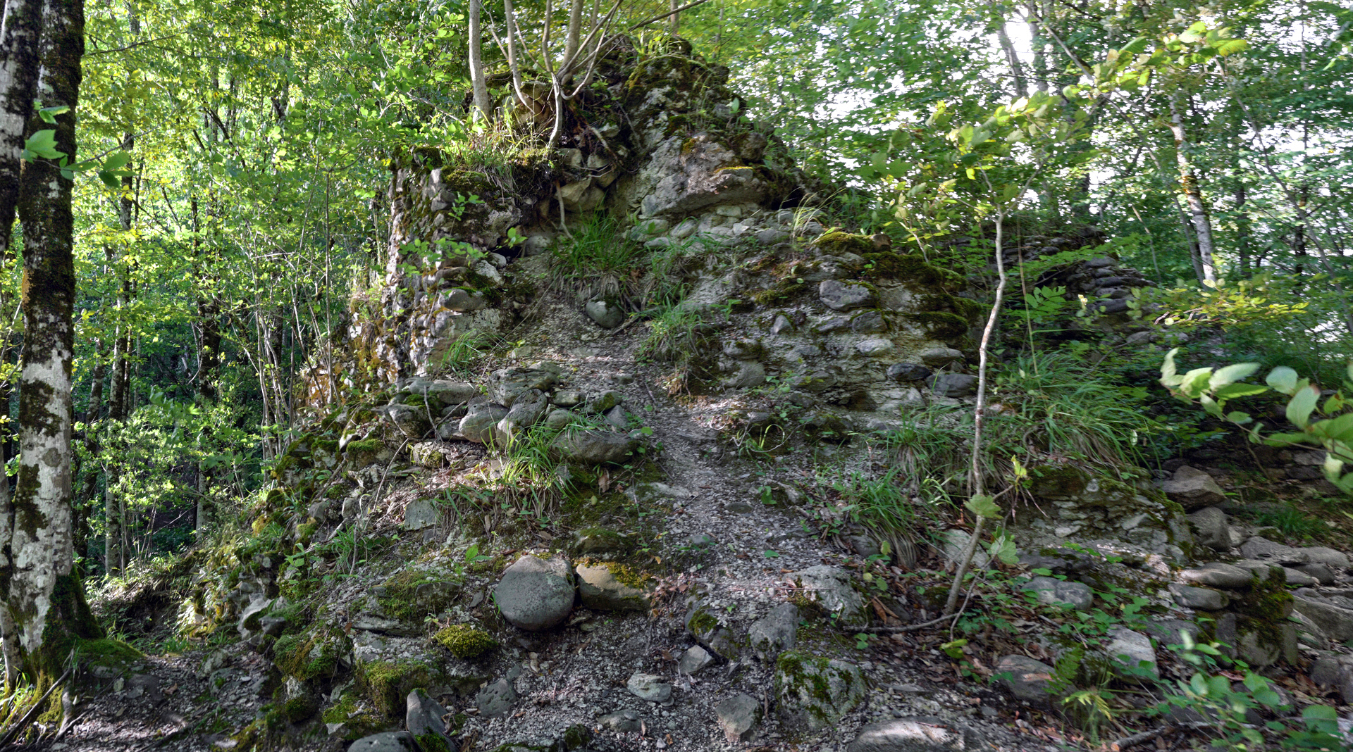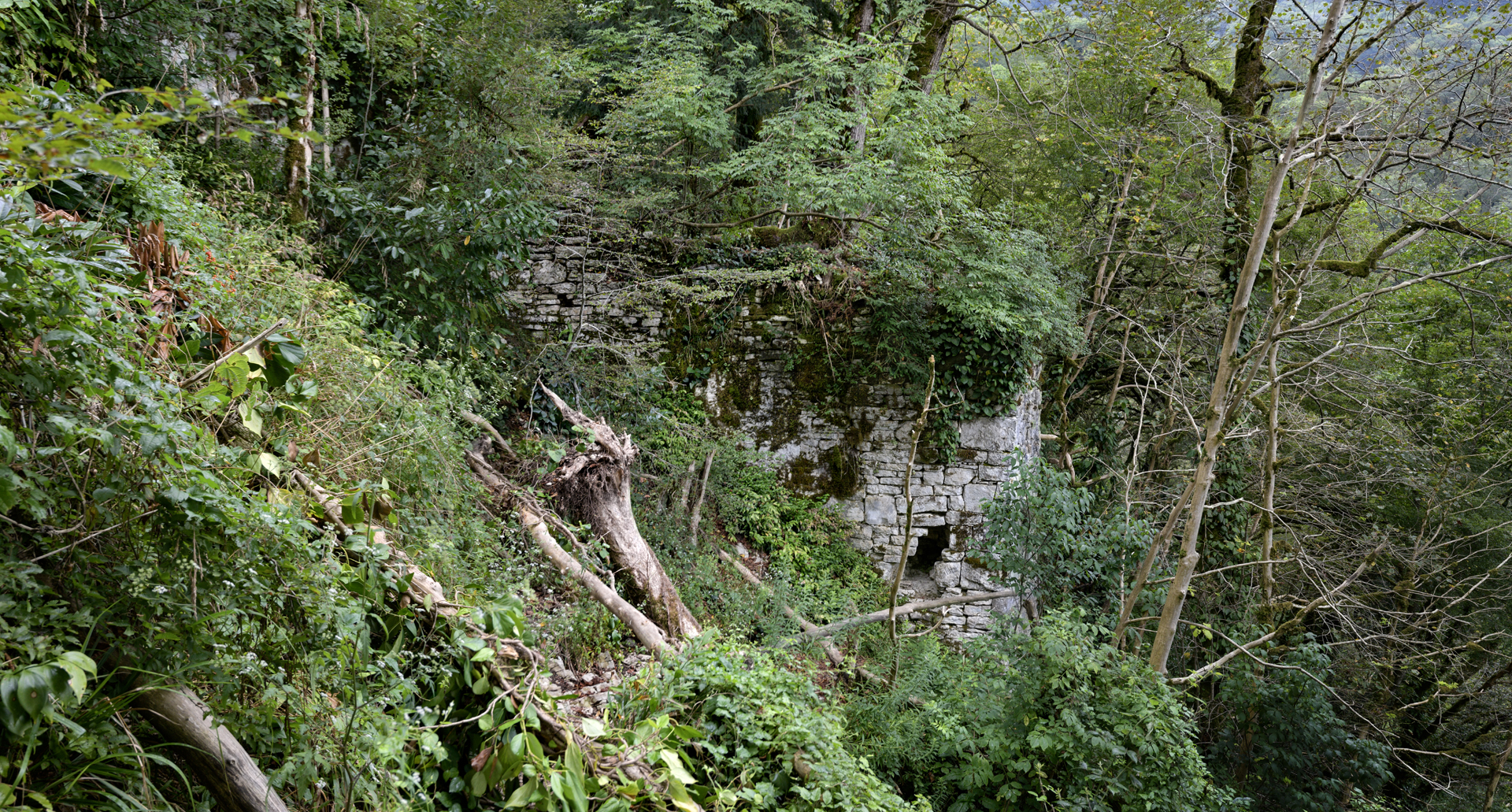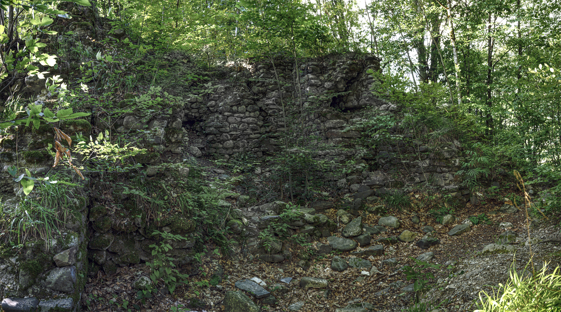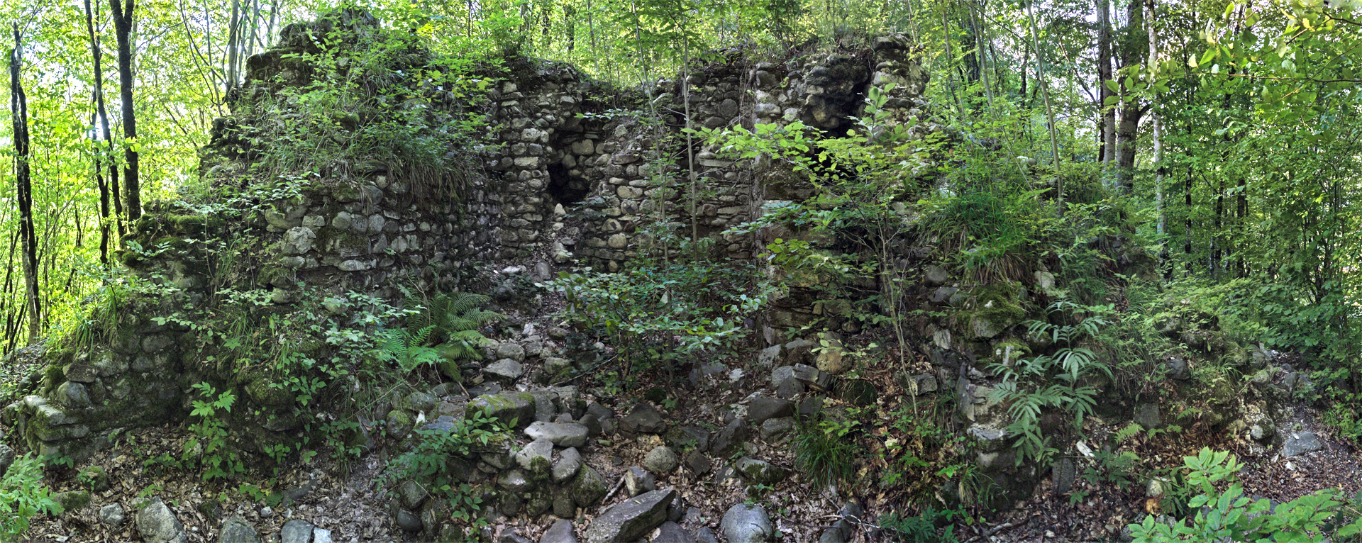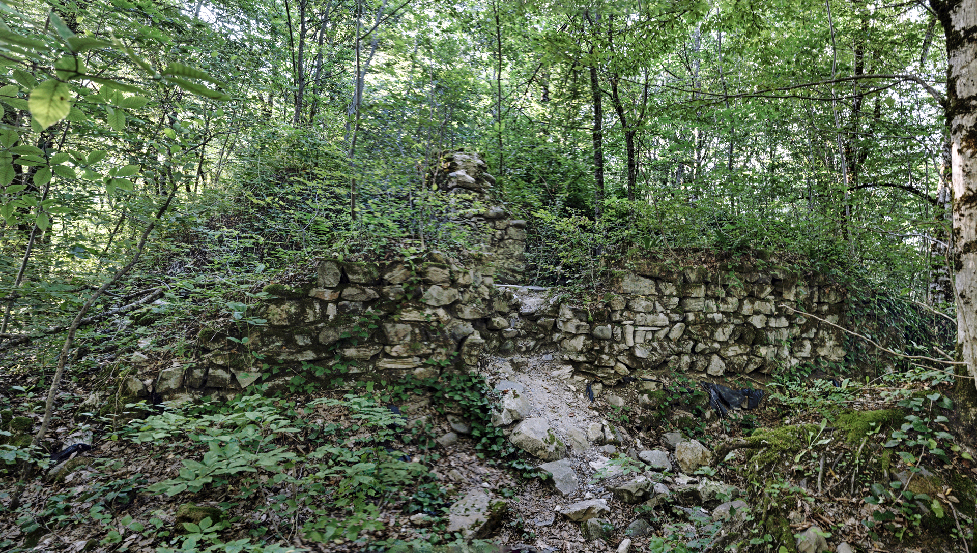 Крепость была построена предположительно во второй половине VII – начале VIII вв, но позже перестраивалась и просуществовала до XIII (возможно, XIV) века. Фотографии в статье 2009 года, ссылку на которую я привел выше, были сделаны во время археологических работ много лет назад. Руины, очищенные тогда от растительности, уже покрылись кустами, деревьями и прочей живностью. Возвращаться к крепости в обозримом будущем я не планировал, поэтому, несмотря на вечер в горах и большие перепады освещенности, попробовал делать панорамы, чтобы сохранить более полное представление о том, как все здесь выглядело в 2025 году. Получившиеся фотографии мне не понравились, и долгое время я не хотел делать заметку о крепости, но потом решил, что информация может быть кому-нибудь полезна. Восточную часть угловой башни я обошел с юга на север, снимая в западном направлении | ||||