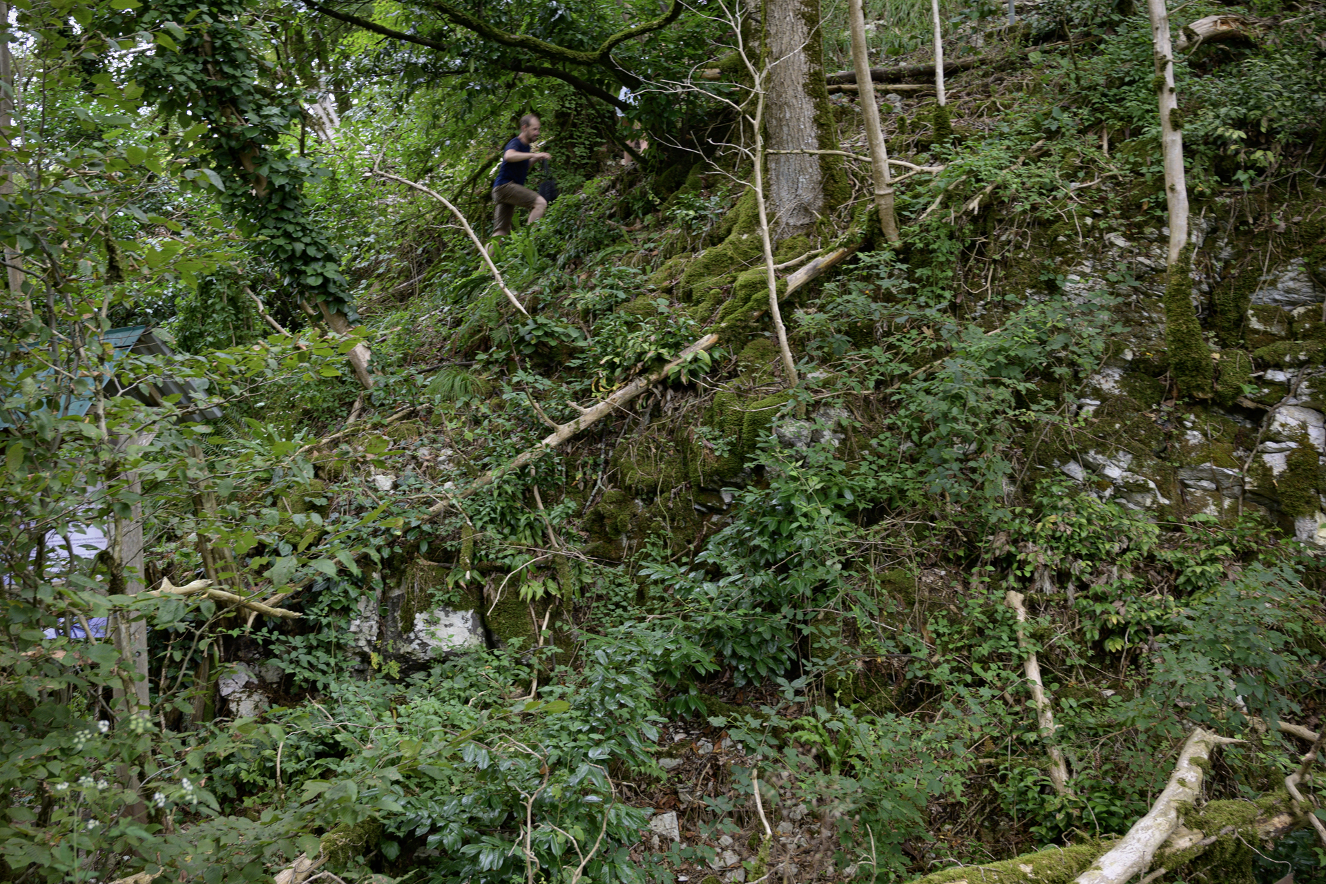 Так или иначе, "устремляющийся вниз" участок стены наверху опознать можно, но ниже он покрыт густой растительностью. Справа на снимке "луч стены", продолжающийся по периметру крепости. Слева вдалеке наиболее сохранившийся и заметный снаружи участок стены | ||||